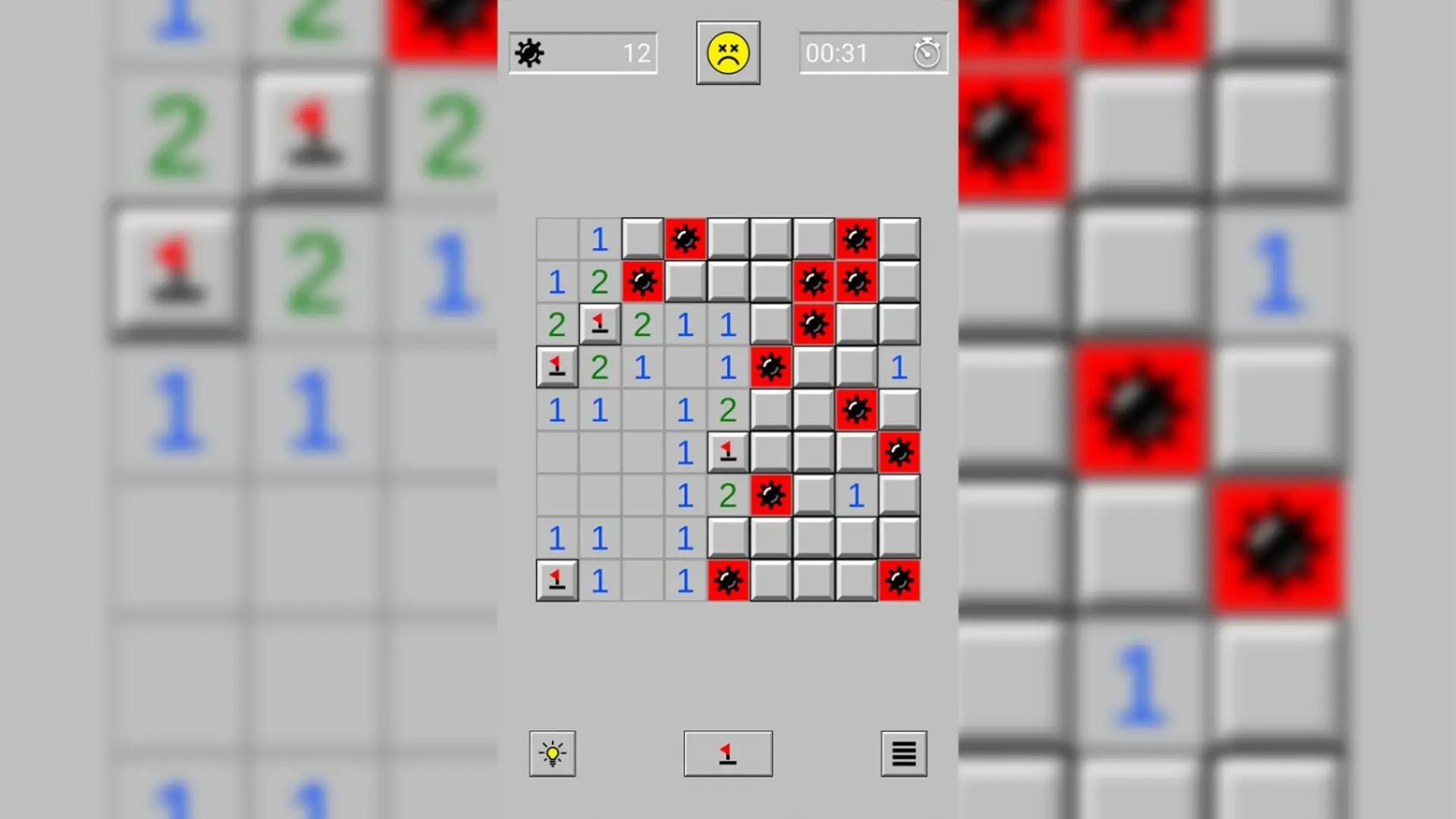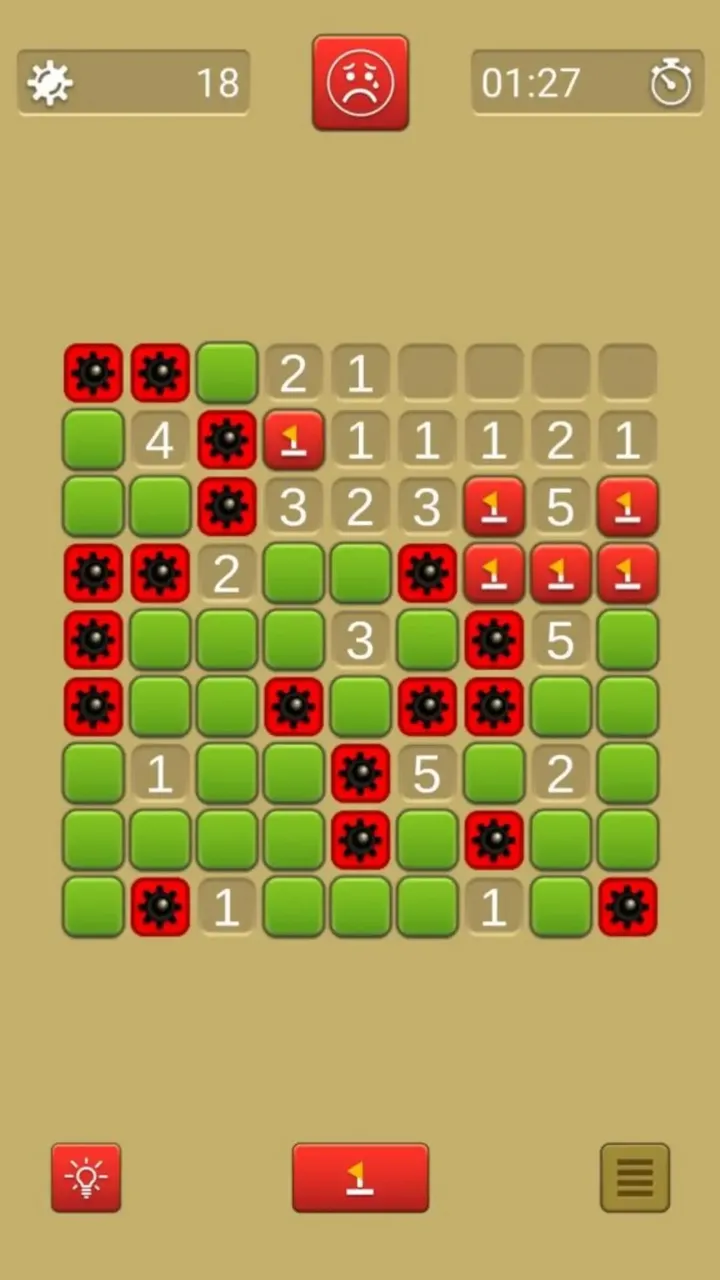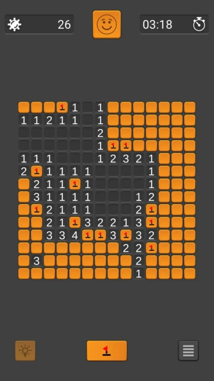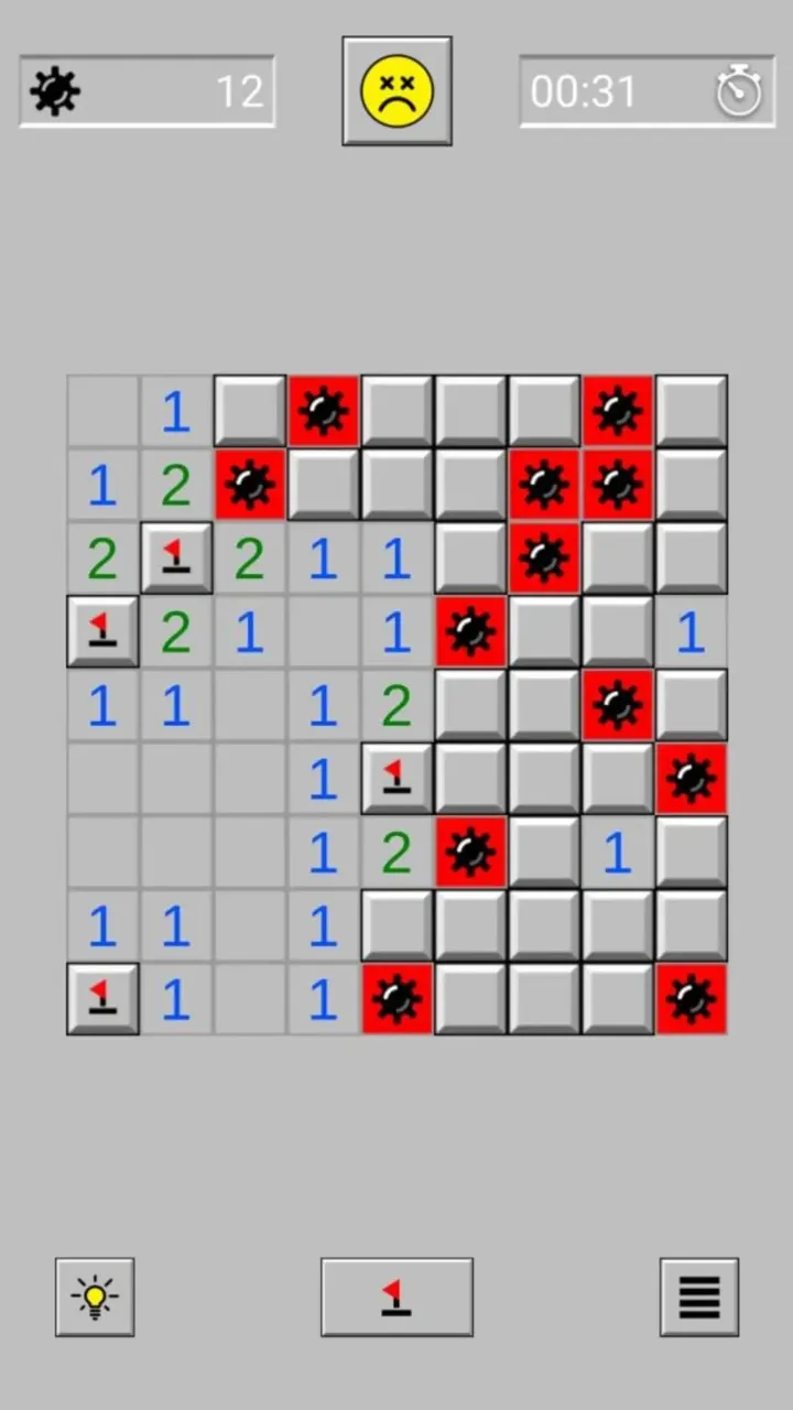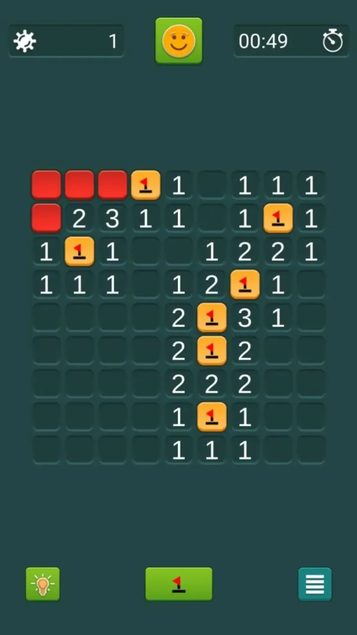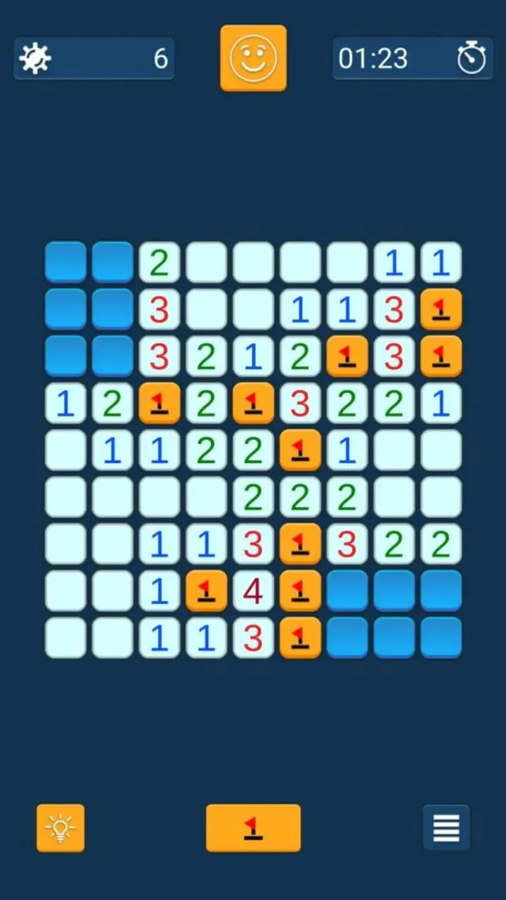 Click on a square to reveal it. By long pressing you can put flag on the square or you can also switch between digging and flagging mode at the bottom of the screen. By clicking on the light bulb you can activate the hint.